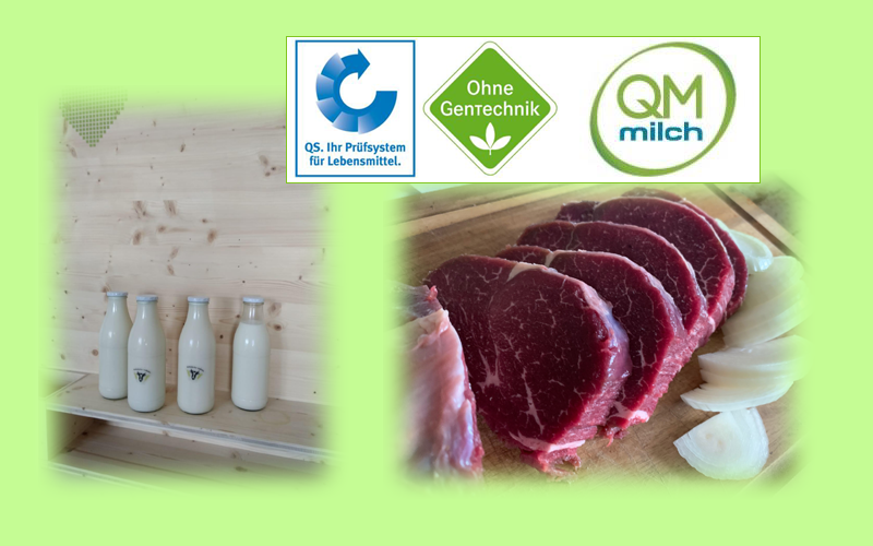 VLOG-Zertifizierung in unseren Betrieb werden hauptsächlich eigens produzierte Futtermittel zur Verfütterung unserer Milchrinder eingesetzt und seit 2017 werden die Transportwege und Herkunftsländer von jeglichen zusätzlich eingesetzten Futtermitteln bzw. angebauten Sorten überprüft und kontrolliert. So kann garantiert werden, dass keine GVO enthalten Futtermittel auf unseren Hof gelangen und verfüttert werden. Mit diesen Maßnahmen können wir sagen, dass ausschließliche GVO-freie Milch bei uns erzeugt wird. Die VLOG-Zertifizierung beinhaltet die QS- und QM-Zertifizierung, welche für die GVOfreie Produktion von Fleisch und Milch steht. Wir sind VLOG-, QS- und QM- zertifiziert. Unser produziertes Fleisch bzw. unsere erzeugte Milch tragen folgende Label:
